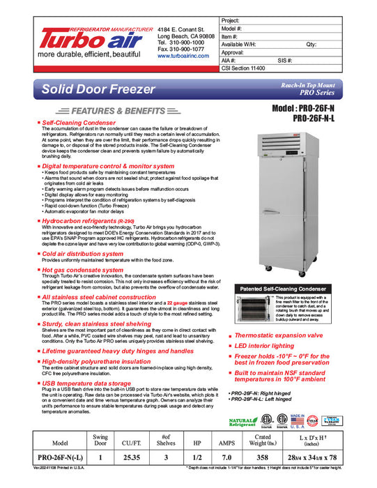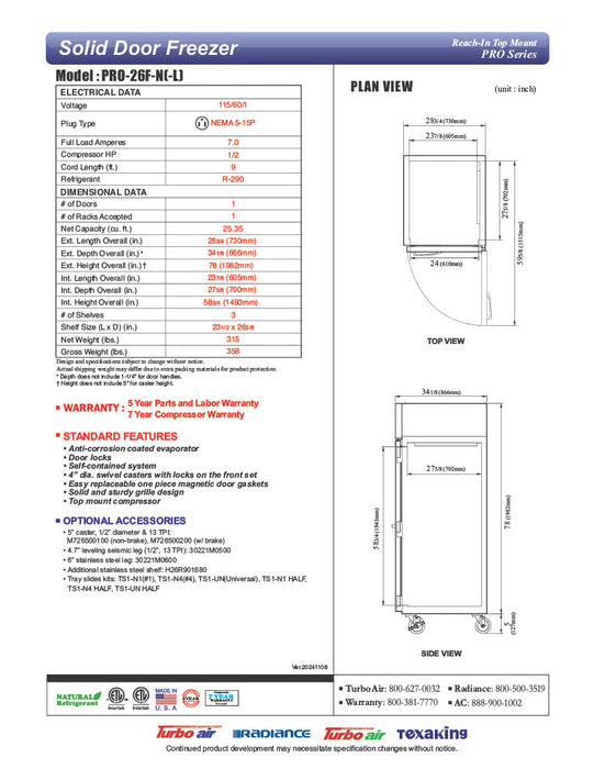 Turbo Air PRO-26F-N 29" Premiere Pro Series Solid Door Reach in Freezer