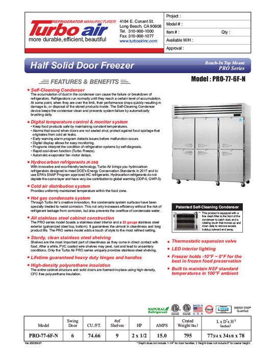 Revolutionize your kitchen with the impressive Turbo Air PRO-77-6F-N 78" Premiere Pro Series solid half door reach in freezer! With precise digital temperature controls and a stainless steel interior and exterior, this freezer offers maximum control and effortless cleaning. The half door design ensures superior temperature maintenance and energy efficiency, while 9 adjustable heavy duty stainless steel shelves provide flexibility for your ever-changing menu. Elevate your business with this exceptional freezer today!