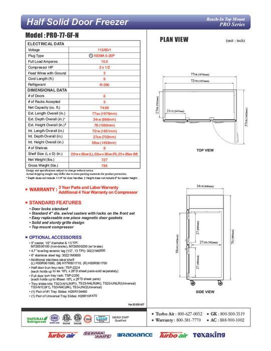 Turbo Air Refrigeration PRO-77-6F-N Details